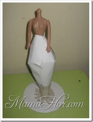 - Con el disco pasarlo en cartón dúplex que servirá como base de la muñeca, pegar el cartón dúplex al disco, aparte asegurar con silicona el molde de la falda de la muñeca, unir con la parte cortada la parte inferior de la muñeca con la base del cd.