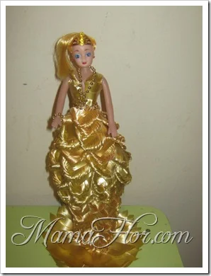 - Pegar con silicona las escamas por toda la falda y cubrir con las hojas toda la base, decorar la blusa de la muñeca a imaginación propia o como se muestra en la imagen.