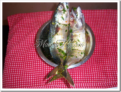 5. Luego echar dicha preparación dentro de la caballa fresca . (el relleno se echa por la cabeza.)